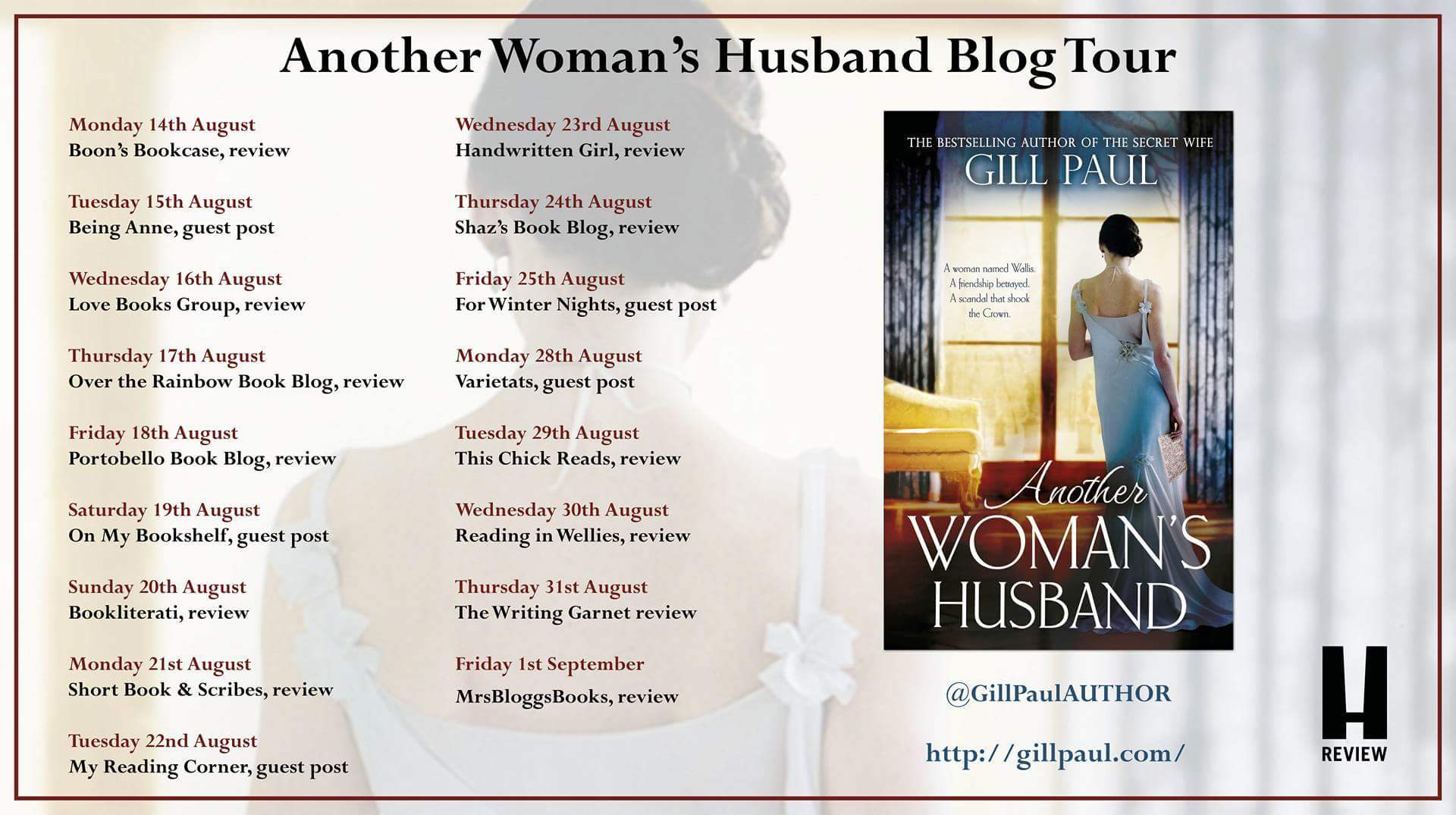 It’s no secret that I am a huge fan of Gill Paul’s novels, so when I found out that her latest novel, Another Woman’s Husband was based on the fictional connection between Wallis Simpson and Princess Diana, I just knew I would love this book! I am a passionate royalist and always loved Princess Diana from the very moment she came into the public eye. With the 20th anniversary approaching of Diana’s death, it seems very poignant that memories of her are kept alive. I will remember 31st August 1997 for the rest of my life as a day full of extreme sadness and unbelievable shock that one of the most famous women in the world had died so tragically.